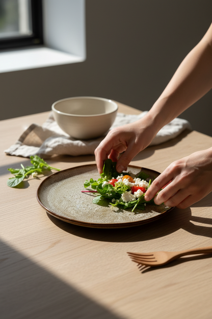 The irregularities in its form and texture tell a story of handcrafted artistry, inviting you to appreciate the beauty found in life's subtle nuances. "Wabi Sabi plate" is more than a plate; it's a mindful companion to your dining experience, encouraging you to savour each moment and find joy in the imperfectly perfect.